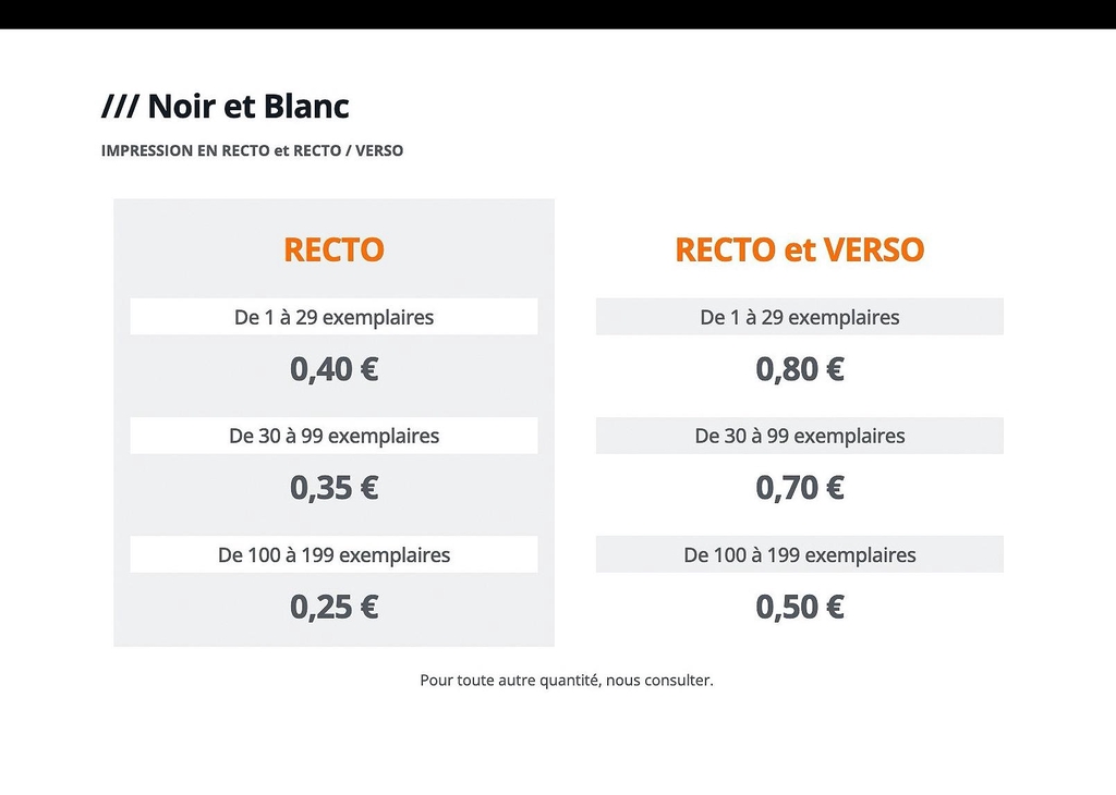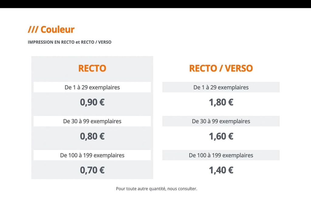 Le recto et verso, est considéré comme une impression (ex. : 1 page recto et verso est considéré comme 2 pages dans le tarif affiché, soit le prix unitaire x2).